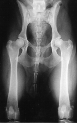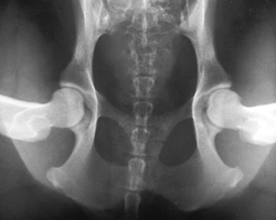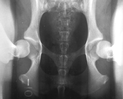 The looser the joint on the distraction view, the greater is the chance that the hip will develop OA. The hip-extended view tends to mask true hip joint laxity because the joint capsule is wound up into a tightened orientation when the hips are extended. This explains why measurable joint laxity on the distraction view is always greater than the measurable laxity from the hip-extended view. In fact, distraction laxity is up to 11 times greater depending on the breed of dog under study. |